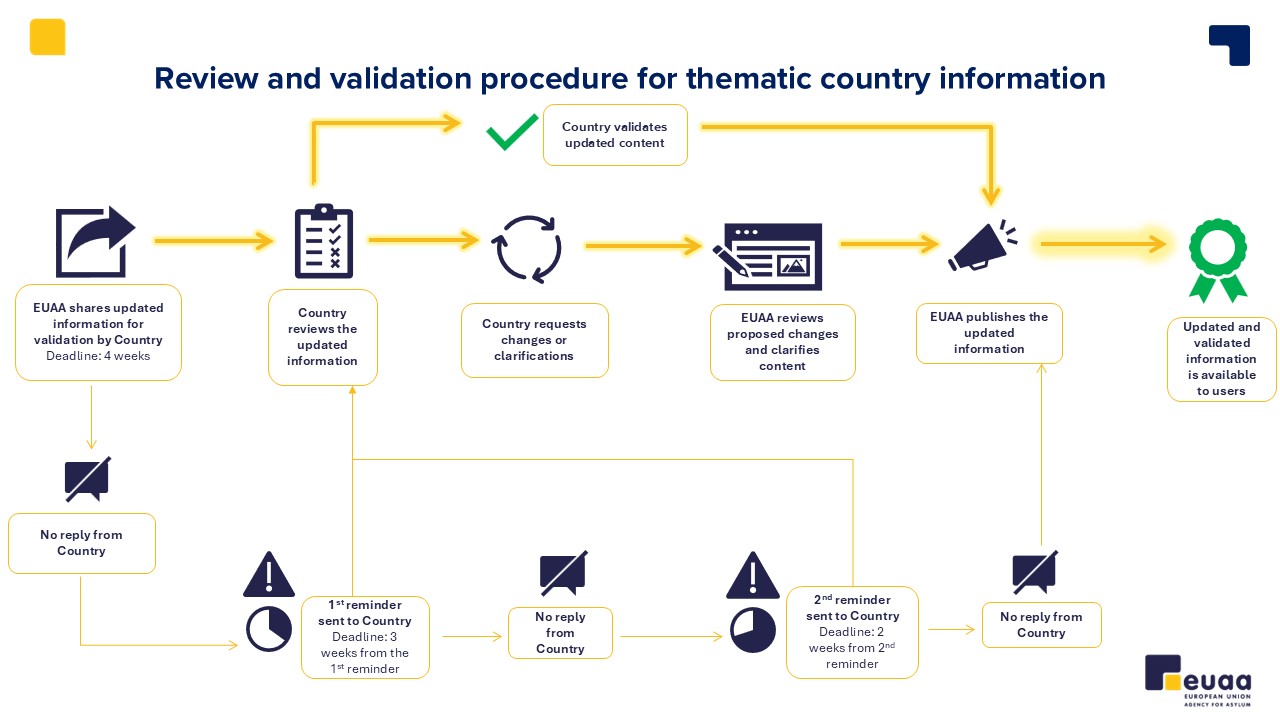 The EUAA conducts desk research throughout the year to update the information in the thematic country pages. National administrations verify the accuracy of the information through a validation process within a defined 9-week timeline. Disclaimers on a thematic page notify users when content is undergoing a review and validation process, and when content has been validated.